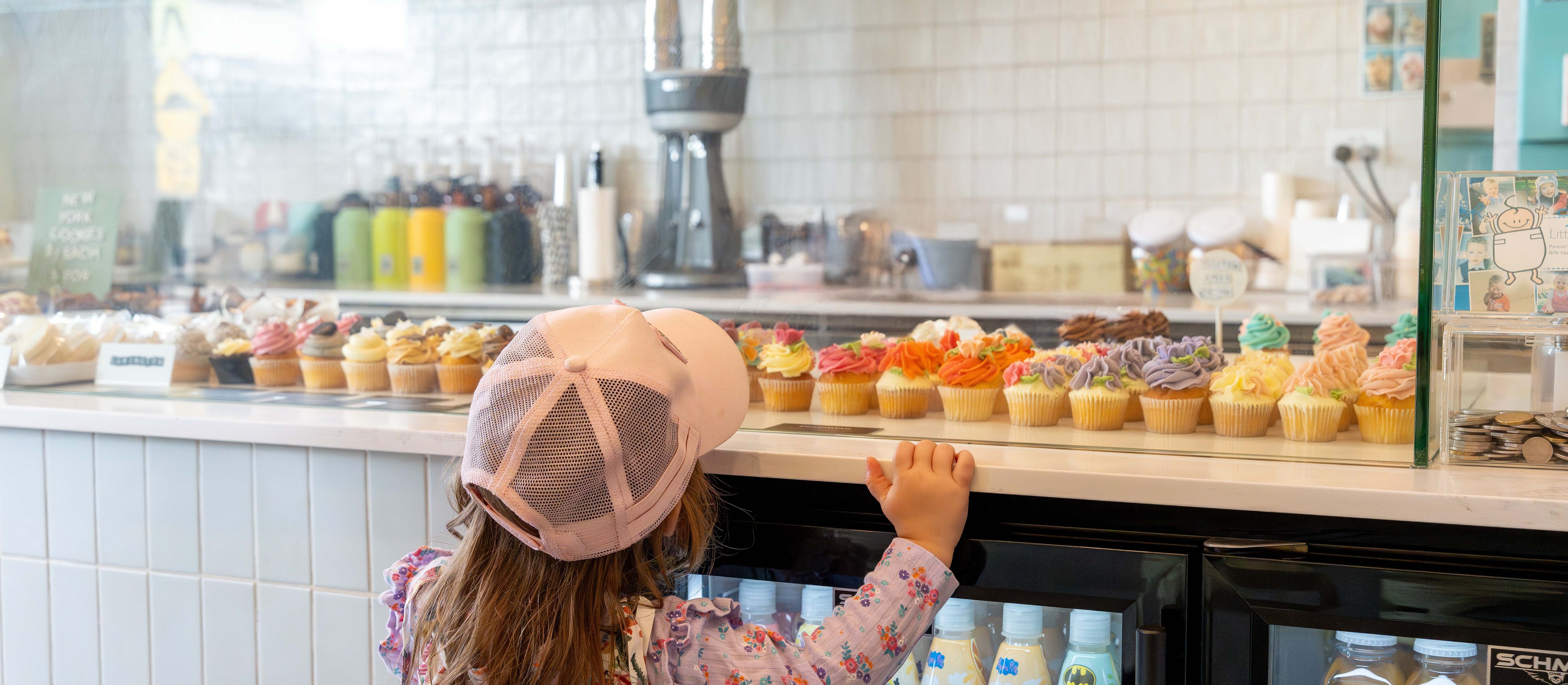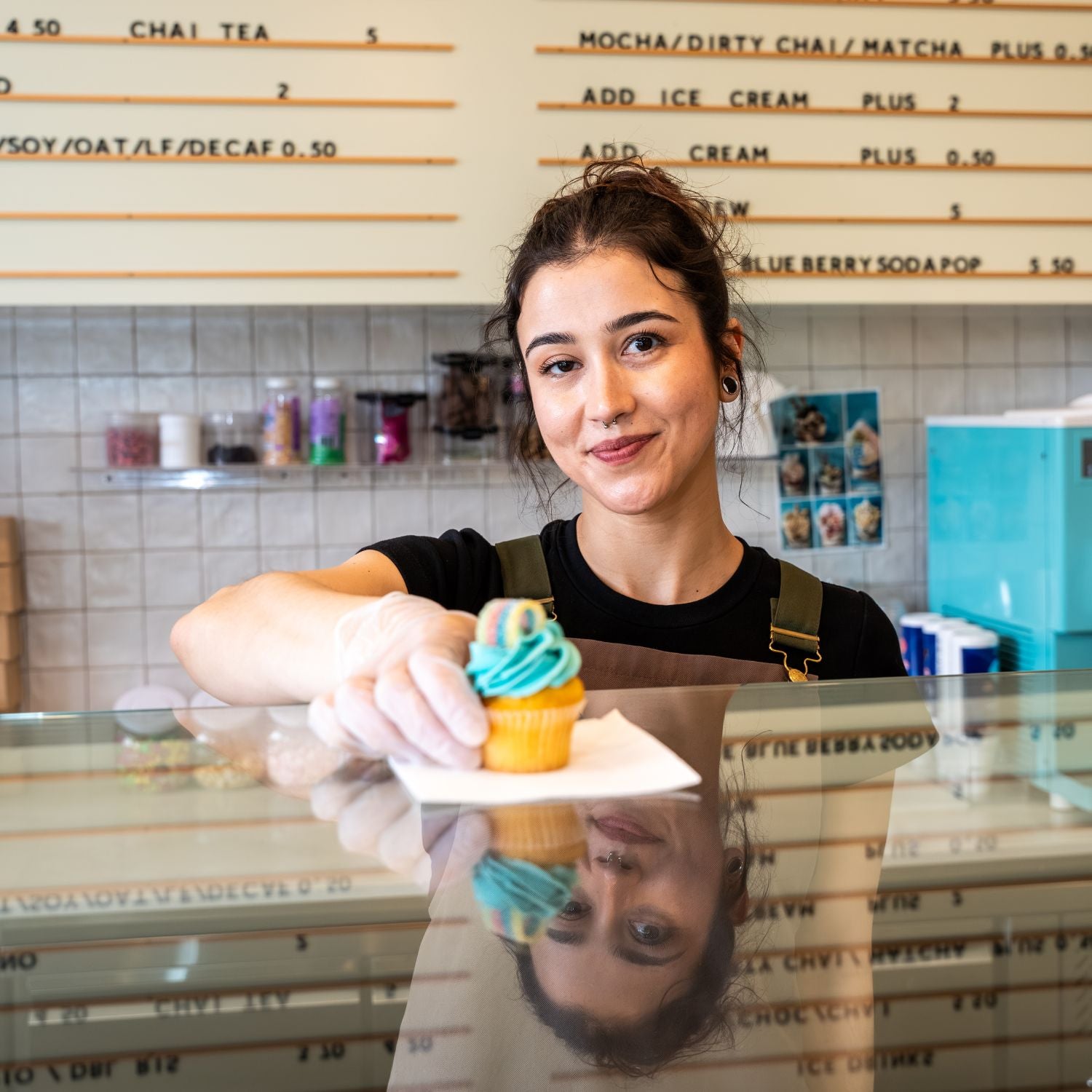 We prepare all of our products in our adjoining commercial kitchen, ensuring everything we offer is super fresh! Our store is open Tuesday to Saturday, serving a wide selection of cupcakes, New York–style cookies, brownies, gelato & gelato cakes, specialty coffee, sodas, and much more.