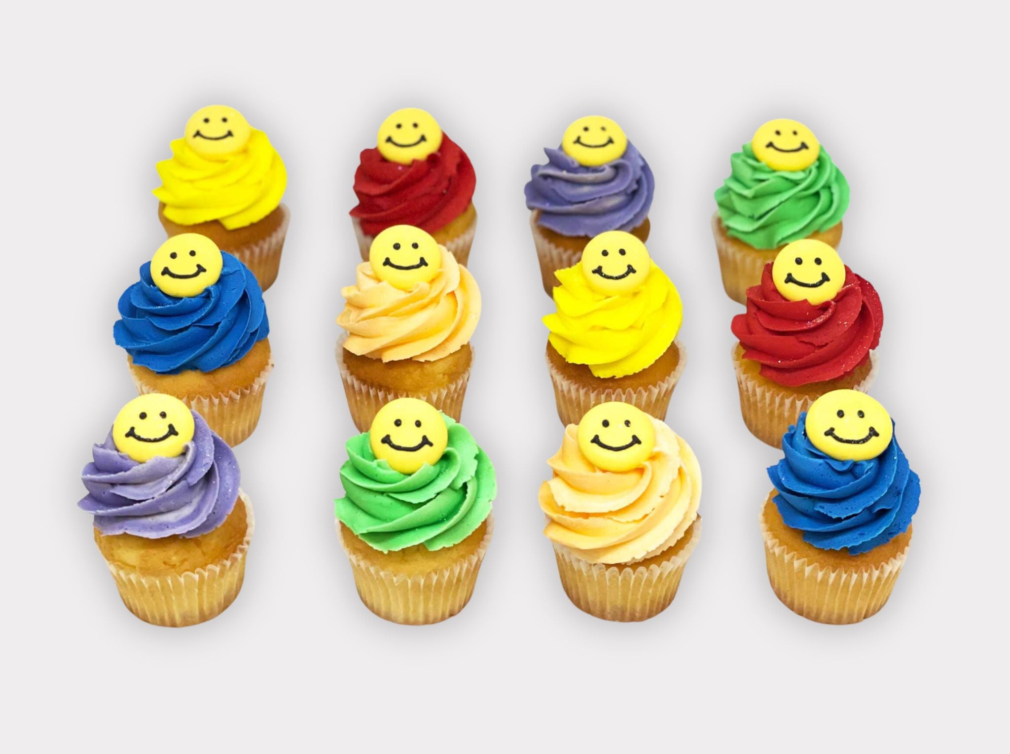 Our R U OK? cupcakes are a delicious award-winning butter cake, with half of the box containing the R U OK? Logo, printed on edible paper and placed onto a white disk, resting on a swirl of deliciously decadent buttercream made with real butter. The other half of the cupcakes in the box will have our signature swirl of yellow buttercream and black sprinkles.